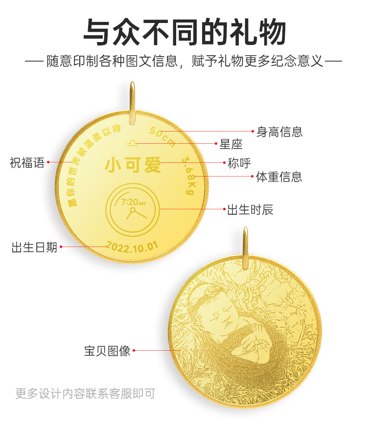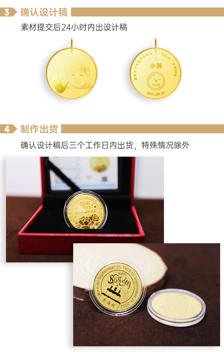 黃(huáng)金(jīn)定制(zhì)™¶γ金(jīn)币吊牌寶寶牌出生(shēng)足金(j☆īn)圓牌吊墜手腳印刻字紀念日(rì)禮物(wù)
